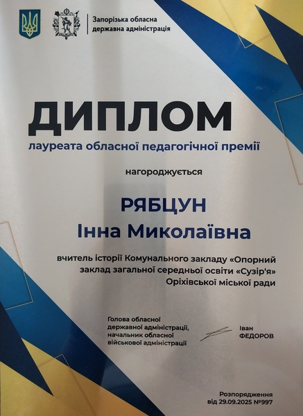 За заслуги у сфері освіти, відповідно до рішення ЗОДА, вчитель історії, громадянської освіти, заступник директора КЗОЗЗСО «Сузір’я» Оріхівської міської ради, відзначена престижною професійною нагородою – обласною педагогічною премією.